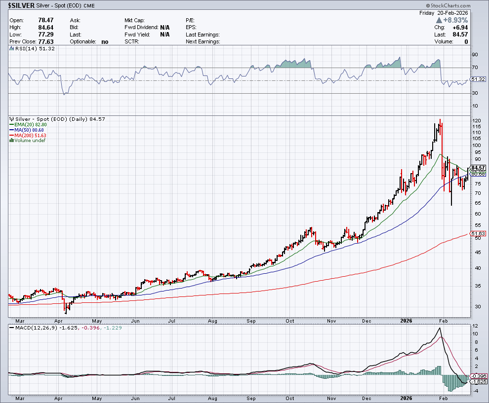 “Please notice the “hook” in the bottom right hand corner being formed by the MACD. A crossover from here is to be expected which flips the short term trend back to bullish. 1st notice day for the March Silver COMEX contract is this Friday. Even if the current inventory does satisfy delivery notices, does the registered category become crippled? I rarely make short term bottom calls (the last time was back in April 2024), but I believe the bottom is in and we are about to witness action in the precious metals never seen before. You are watching the end of exactly 50 years of COMEX metals suppression. Put your seat belts on and cinch them tight, the move is up but the volatility will shift into higher gear(s)!”