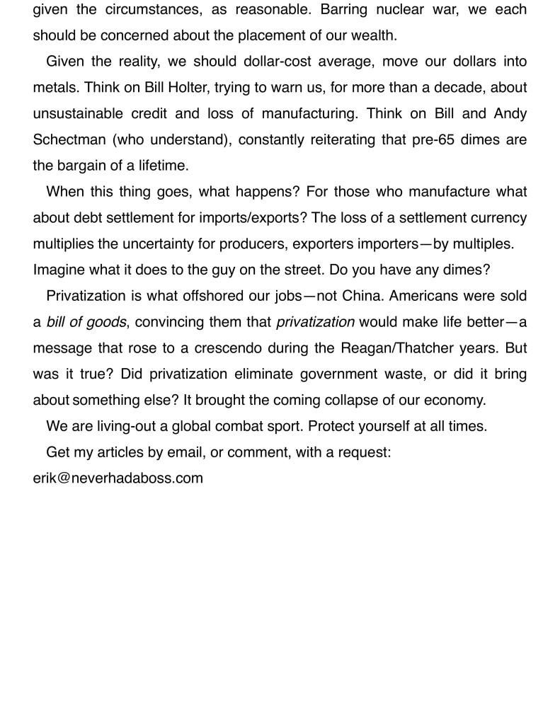 The pendulum swings. I put up with so many years of the pendulum stuck in the left as if defying gravity. Now it’s swung somewhat back towards the right but never gets even to the middle and definitely not far enough to the right for me who wants the most limited of limited (read barely existent) federal government. I’m not stuck in the middle. I’m stuck in the far right (bad connotation nowadays) merely wanting to be left alone – which is, I believe, an “ancient” attitude of this nations explorers, pioneers and early settlers. But we always lose. We’re never allowed to be left in peace – someone always shows up to build a school, a church and then a government building from which soon are flowing a myriad of new regulations – under the guise of “progress” and the freedom to live as we want and as our Creator has allowed, is usurped little by little. The desire/responsibility to help family and neighbors is exchanged for wanting help from the government in some form – and thus the trap slams shut. So the few of us left with this gnawing, innate curse of freedom to the core, takes our pleasure from faith in God; living one with Him in His amazing creation; and trying to be as self-reliant as possible so as to truly be free to live the way we want and with whom we want and not slaves to the system in any form. Perhaps that’s why the late Jim Sinclair and my good friend Bill Holter’s G.O.T.S. teaching has resonated with me from the beginning with me as I’ve tried to live like this as much as possible with kids and businesses for most of my life. Getting out of the system entirely is difficult to do but the journey to get there is worth the effort. I don’t relate to clowns or jokers either. But we will see who is left standing, or at least breathing, when the dust settles on this once great idea of America.