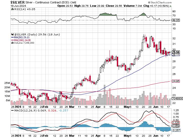 ”Is silver bouncing exactly where it is supposed to? $29 is support from the previous highs back in April and also support from the 50 day moving average. Given a week or so, this looks like we may see another “hook” in the MACD turning upwards and crossing over. I think we could see at $34-37 on this next leg but we need to see more work done here digging off support. In any case, a very big move either up, or down is in the cards as we have spent nearly 3 weeks chopping in the $29-31 zone, not overbought nor oversold on the daily’s and coiled for a move one way or the other. Add the fundamentals where silver is in a structural deficit and a snorting bull market/major short squeeze looks likely. Stay tuned!”