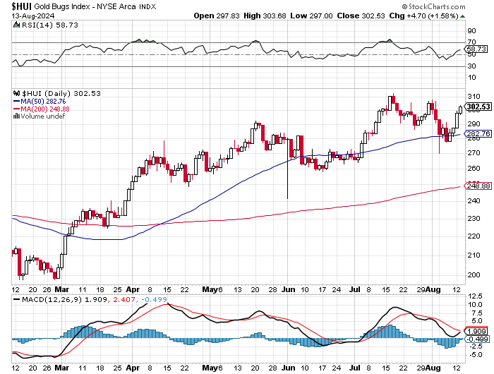 I posted these three charts back on July 31 positing a move higher was imminent. It looked to be working well for a few days until the Japanese meltdown occurred and the moves were aborted. But here we are again in a very short period of time. Gold has already broken to new highs with the MACD crossing over to the upside. Both silver and the HUI have MACD lines touching and poised to cross to the upside. We have been watching the famed “Swiss stairstep” upwards since last October, it appears another step higher is imminent. I should also mention, when the system itself begins to break down, the step(s) higher will shock everyone!”