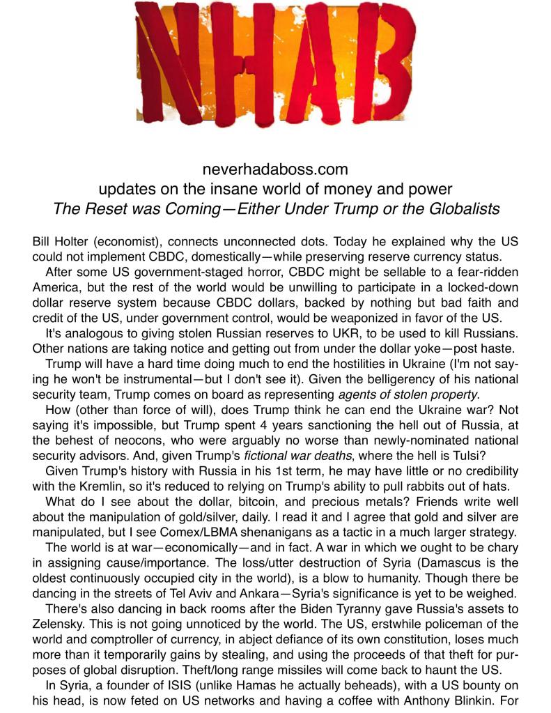 “If you look back at a chart, gold (and silver) back in October 2022, bottomed one day after the US Treasury said they were sequestering (confiscating) $300 billion+ of Russia’s Treasury reserves. The entire world saw this, do you really believe the world will be on board to store their wealth in something that can be shut down and taken electronically by the whim of a computer keystroke? No matter what, the US Dollar will lose its reserve currency status… B.R.I.C.S.”