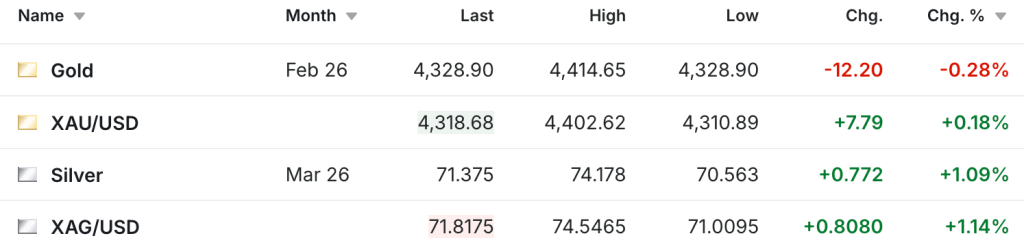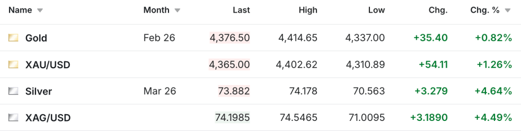 The gold and silver markets were off to a strong start in 2026, with the gold futures up $35 to $4,376, and the silver futures up $3.28 to $73.88.