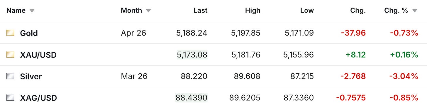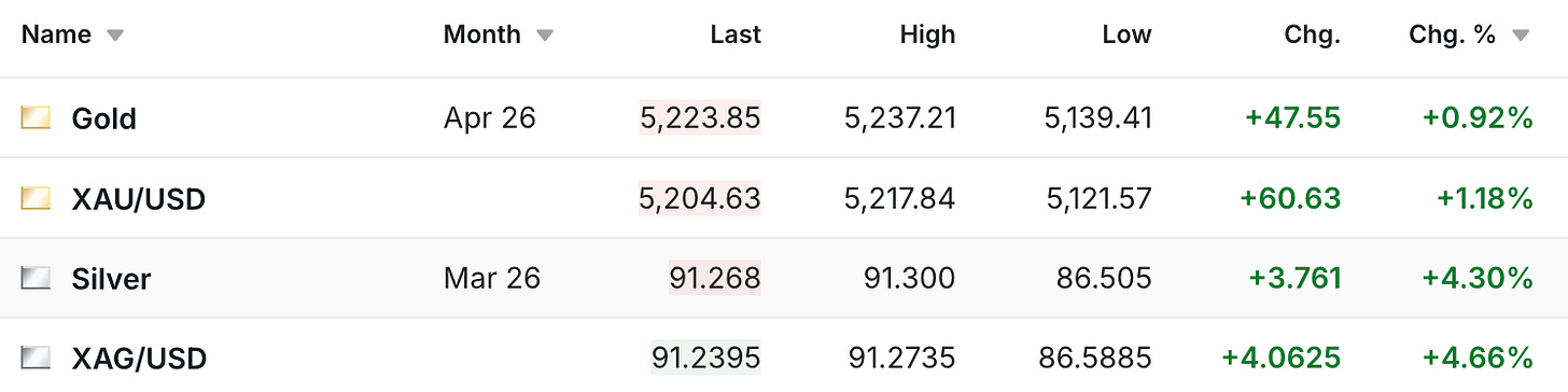 The gold and silver prices continued their rally on Wednesday, with the gold futures at one point up another $47 to $5,224, while the silver futures were having a really big day, up $3.76 to $91.27.