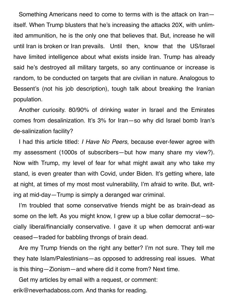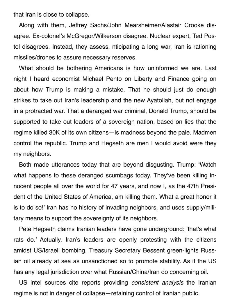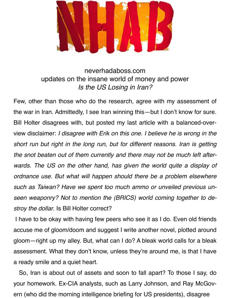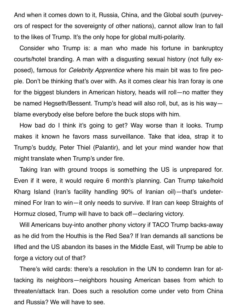 “I guess we will know who is correct in the short term soon enough? I see Iran without an air force nor navy, that is not “winning.” Long term (maybe measured in only months?) the $ is toast. As I posted, this military operation is not going over well with the BRICS nations (and new pledges). This is incredibly dollar bearish no matter what the military outcome.”