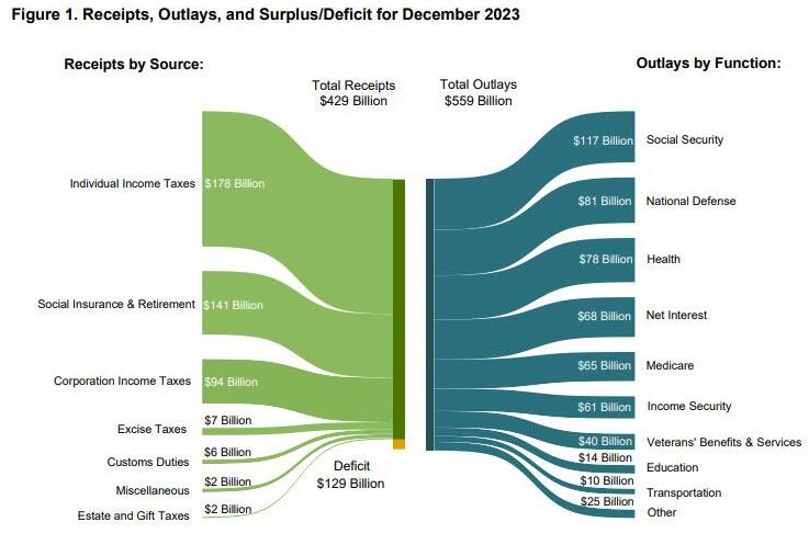The U.S. federal government published a December deficit of $129 billion, up 52% from the previous year. The private sector recession is clear as expenses continue to rise while tax receipts decline. If we look at the period between October and December 2023, the deficit ballooned to a staggering $510 billion.