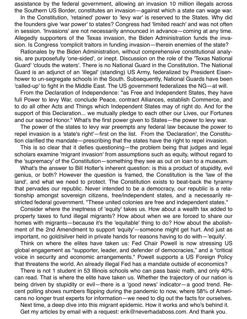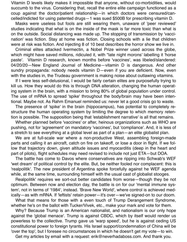 “Erik on the vaccine. I am not a doctor or scientist, so I don’t know if what he says is hard fact or not. What I do know, if you took the vaccine then YOU are the guinea pig. I said this on several interviews back in 2021. The result was Youtube marking a strike against 3 separate channels within just a couple of weeks and shutting ALL 3 down for vaccine misinformation. There are now a huge number of families that have watched members die or be seriously injured from the vaccine. How quaint Youtube, you were doing humanity a favor? They can kiss my unvaxxed ass!”