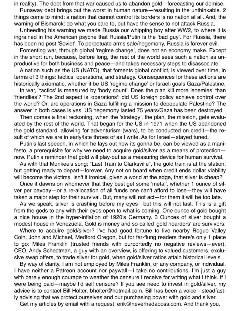 Renowned geopolitical and financial cycle expert Charles Nenner has been warning of a huge war cycle that happens every 120 years or so. With Tiawan/China and Russia/Ukraine and Israel and the Middle East conflicts, we are clearly in this huge war cycle. Nenner also says we are simultaneously entering a huge financial down cycle that could easily turn into the Greatest Depression–ever.
