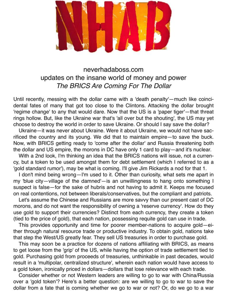 The BRICS nations represent a huge percentage of global population, production and thus trade. They correctly deemed that doing business with the U.S (the West) has not been a good deal for many years as they would ship real goods and be paid in an “unreal” currency, the dollar. I have termed this arrangement as “something for nothing”. Add in the fact that the U.S. has bullied its way all over the world and in several cases just plain confiscated FOREX reserves, and the herd moves at a quicker pace in the opposite direction. I guess the best two recent examples are Britain stealing Venezuela’s gold and the U.S. stealing Russia’s FOREX reserves. Not to mention the stupidity of threatening countries with shutoff from the SWIFT system, this has also hastened the run from the West and into alternative finance and trade agreements.